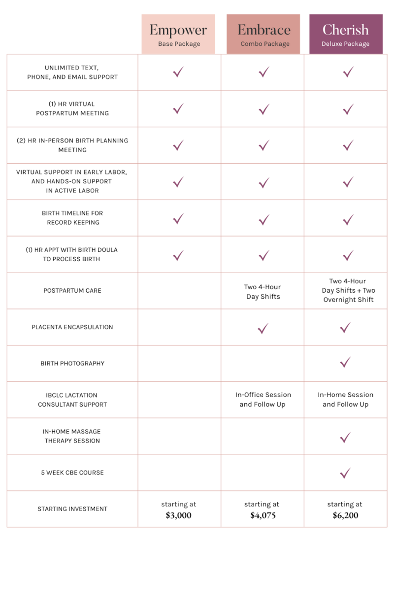 Doulas are changing the landscape of motherhood, parenting, and birth work for generations to come. We would be more than happy to build a custom package for your family with any needed add-on services like education, photography, or placenta encapsulation. Below are our base packages for birth.